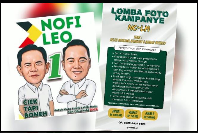 Solok , Utamapos.com | Barisan pendukung Calon Walikota dan Wakil Walikota Solok nomor urut 1 Nofi Candra, SE dan Leo Murphy, SH, MH menggelar Lomba Video dan Foto kegiatan – kegiatan Paslon 01 dengan total hadiah jutaan rupiah yang dimulai dari tanggal 06 November 2024–23 November 2024.