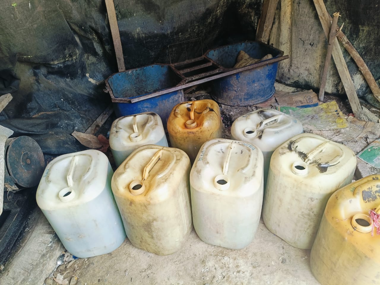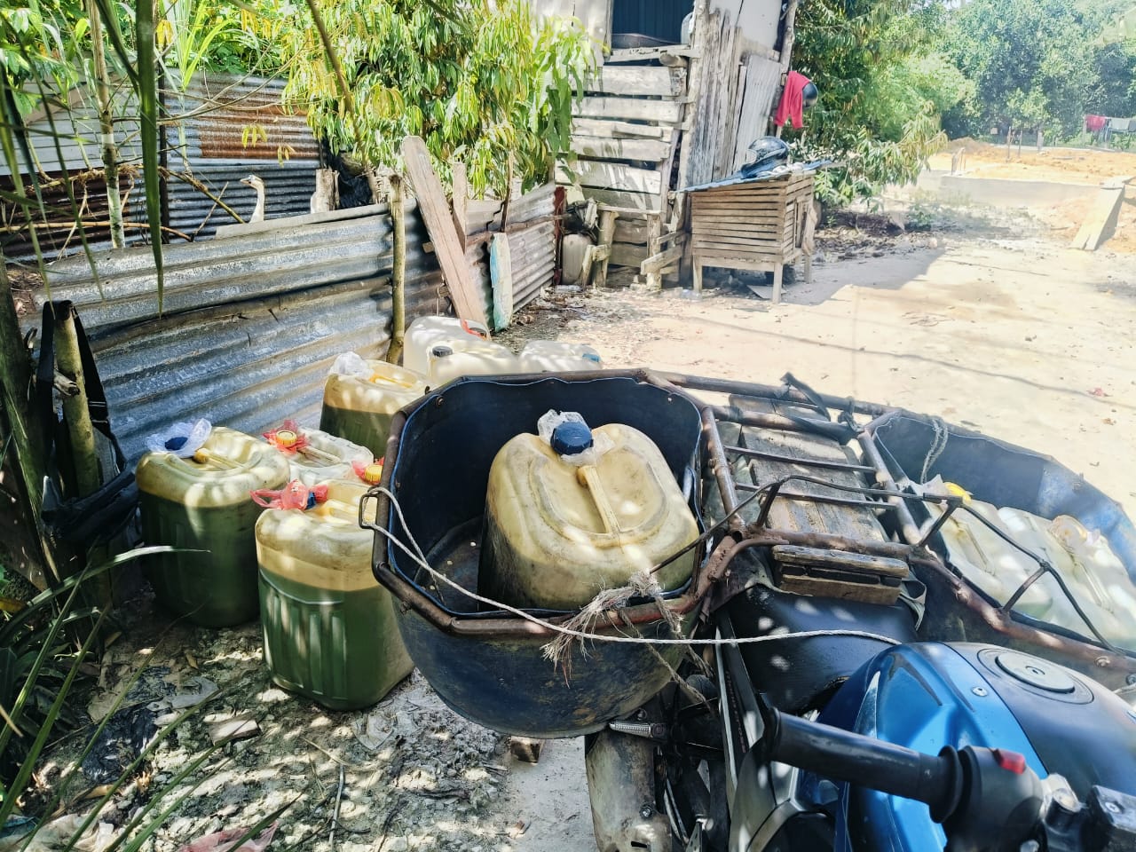 Dari pantauan, terlihat sepeda motor berjenis Bebek tanpa Nomor Polisi menggunakan keranjang tambahan Sedang membawa 2 jerigen berukuran 35 liter akan di bawa ke tempat Pengepul Minyak.
