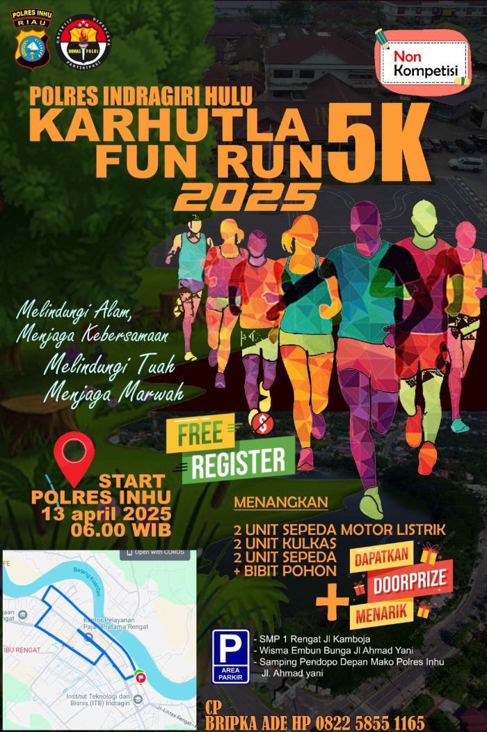 INHU – Dalam upaya membangun kesadaran masyarakat terhadap bahaya kebakaran hutan dan lahan (karhutla), Kepolisian Resor (Polres) Indragiri Hulu (Inhu) akan menggelar kegiatan Fun Run Anti Karhutla pada Minggu pagi, 13 April 2025. Kegiatan ini dijadwalkan dimulai sejak pagi hari dan akan berlangsung meriah dengan berbagai hiburan serta ratusan doorprize dan hadiah menarik yang telah disiapkan panitia.