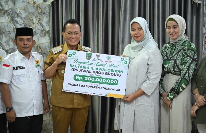 ” Alhamdulillah hari ini Pemkab Rohil menerima secara simbolis penyerahan zakat mal dari keluarga almarhum Awaloeddin atau Rumah Sakit Awal Bross Bagan Batu yang diserahkan oleh direktur Rumah Sakit Awal Bross Bagan Batu dr. Suri Putri Nambita,” kata H. Bistamam.