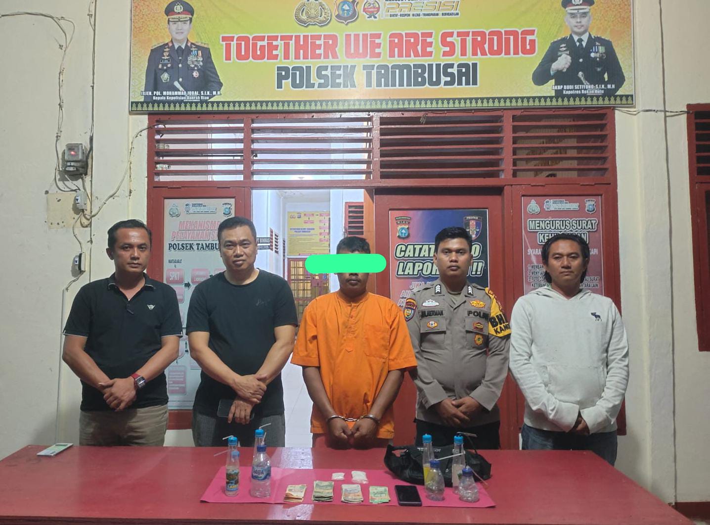 Dari hasil penggeledahan di lokasi kejadian, petugas menemukan sejumlah barang bukti yang menguatkan dugaan tindak pidana narkotika. Barang bukti yang diamankan antara lain, 2 (dua) bungkus narkotika jenis sabu, uang tunai Rp 589.000, 3 (tiga) bungkus plastik bening besar berisi plastik bening kecil kosong, 8 (delapan) buah bong dari botol aqua dan Lasegar beserta pipet bengkok, 7 (tujuh) mancis, 3 (tuga) unit handphone (2 hp oppo dan 1 hp Realme), 2 (dua) tas pinggang, 3 (tuga) kaca pirex dan 8 (delapan) unit sepeda motor. Kesembilan orang yang diamankan beserta barang bukti kemudian dibawa ke Polsek Tambusai untuk pemeriksaan lebih lanjut.