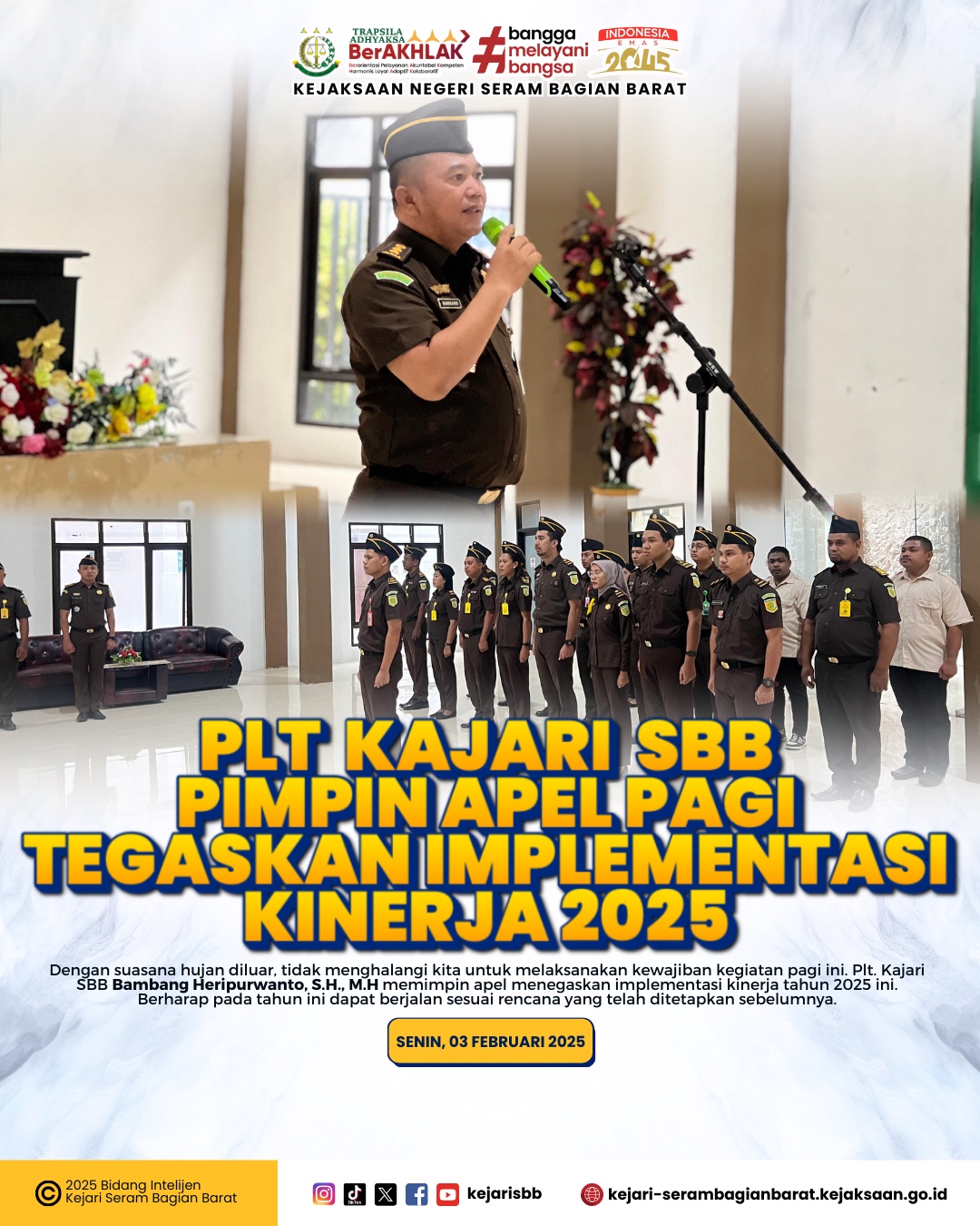 UtamaPos.com || Senin, 03 Februari 2025 bertempat di Aula Kantor Kejaksaan Negeri Seram Bagian Barat, Plt. Kepala Kejaksaan Negeri Seram Bagian Barat Bambang Heripurwanto, S.H., M.H memimpin apel senin pagi diawal bulan ini diikuti oleh para Kasi/kasubagbin, para Kasubsi/kaur, para Jaksa Fungsional dan seluruh Staff Kejaksaan Negeri Seram Bagian Barat.