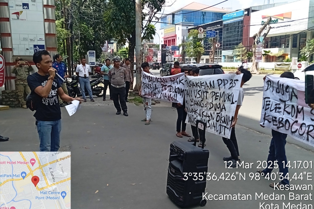 Puluhan mahasiswa yang tergabung dari Koalisi Mahasiswa dan Masyarakat Bersatu Sumatera Utara (KMMB Sumut) melakukan aksi unjuk rasa di depan Gedung Graha Merah Putih Telkomsel pada Rabu, 12 Maret 2025, di Jalan Balai Kota, Kelurahan Kesawan, Kecamatan Medan Barat, Kota Medan.