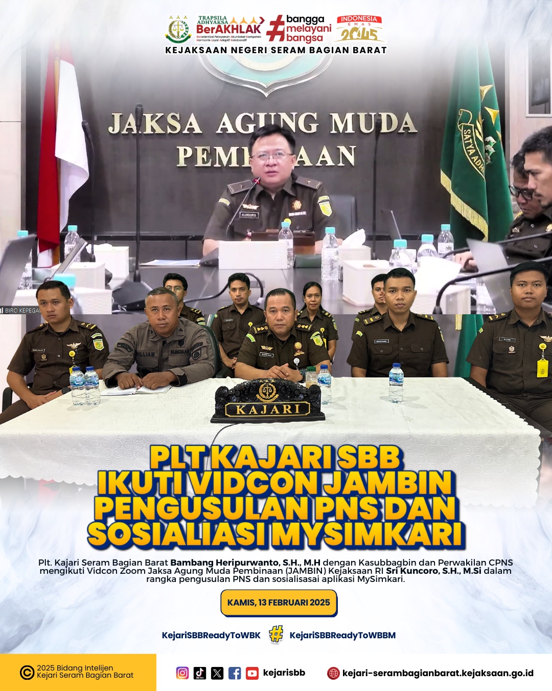UtamaPos.com || Seram Bagian Barat- Kamis 13 Februari 2025, Plt. Kajari SBB Bambang Heripurwanto,S.H.,M.H bersama Kasubbagbin dan Perwakilan CPNS mengikuti kegiatan Zoom Video Conference Kepala Biro Kepegawaian (Karopeg)  Kejaksaan RI Sri Kuncoro, S.H., M.Si dalam rangka pengusulan PNS dan sosialisasi aplikasi MySimkari di Ruang Vidcon Kejari SBB.