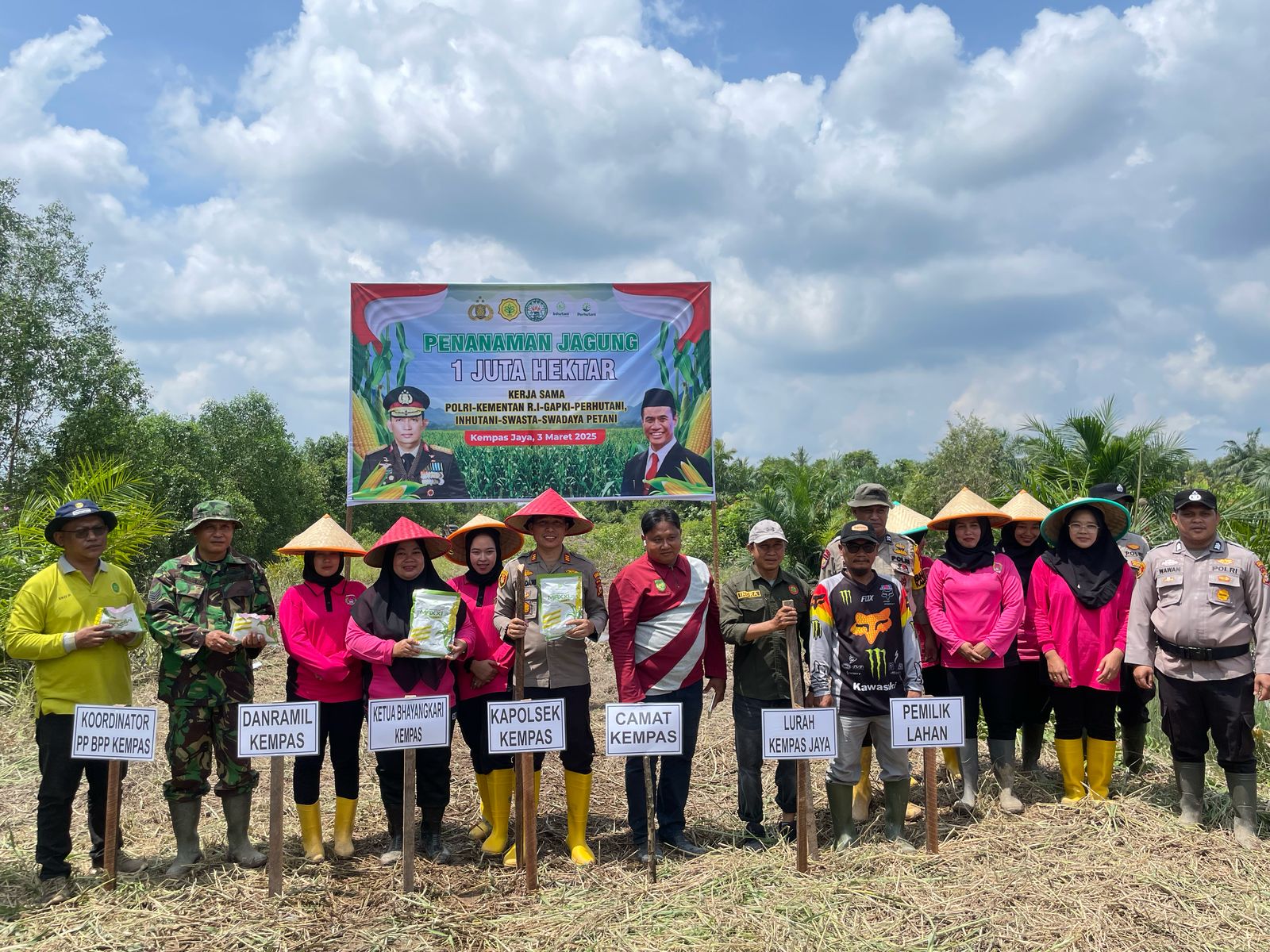 Kempas – Kelompok Tani Berkah Alam Purnama di Kelurahan Kempas Jaya, Kecamatan Kempas, bersama Polsek Kempas dan Bhayangkari, menggelar kegiatan penanaman jagung pipil di lahan tumpang sari seluas 5 hektar sebagai bentuk dukungan terhadap program Asta Cita Presiden Prabowo Subianto dalam Ketahanan Pangan. Saat ini, proses penanaman baru dilakukan di area seluas 1 hektar sebagai tahap awal program pertanian tersebut. (3-3-2025).