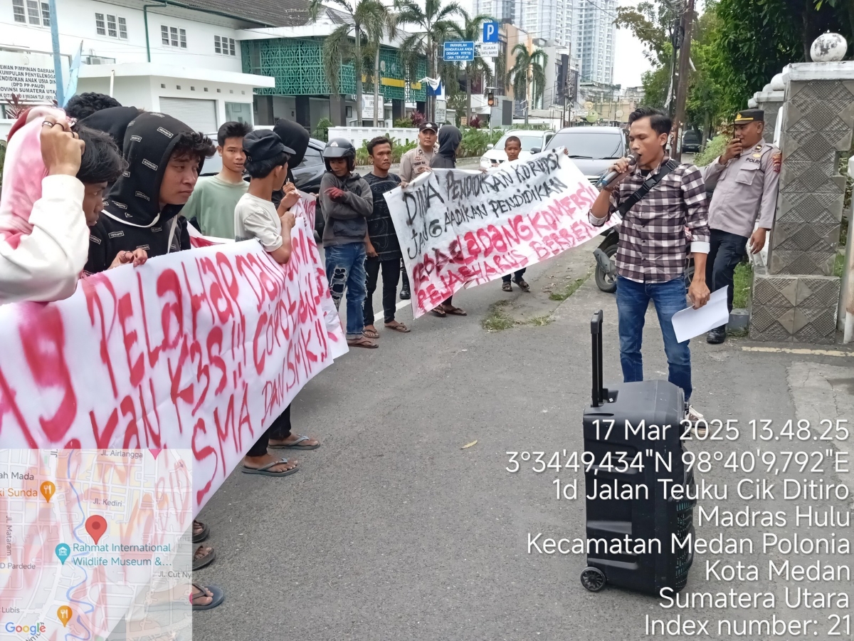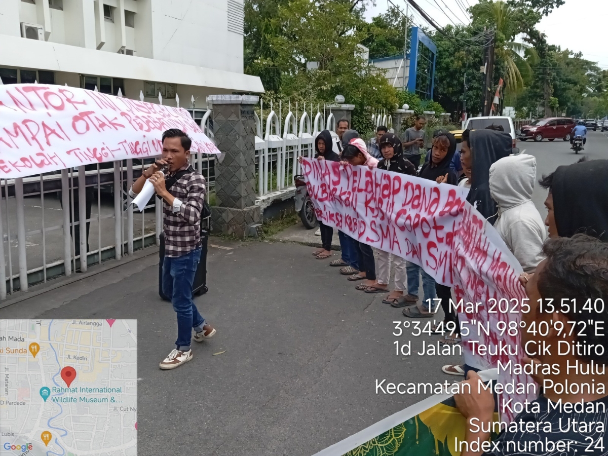 Puluhan mahasiswa yang mewakili Koalisi Mahasiswa dan Masyarakat Bersatu Sumatera Utara (KMMB Sumut) menggelar aksi demonstrasi di depan Kantor Dinas Pendidikan Sumatera Utara yang terletak di Jalan Teuku Cik Ditiro, Madras Hulu, Kecamatan Medan Polonia, Kota Medan pada hari Senin, 17 Maret 2025.