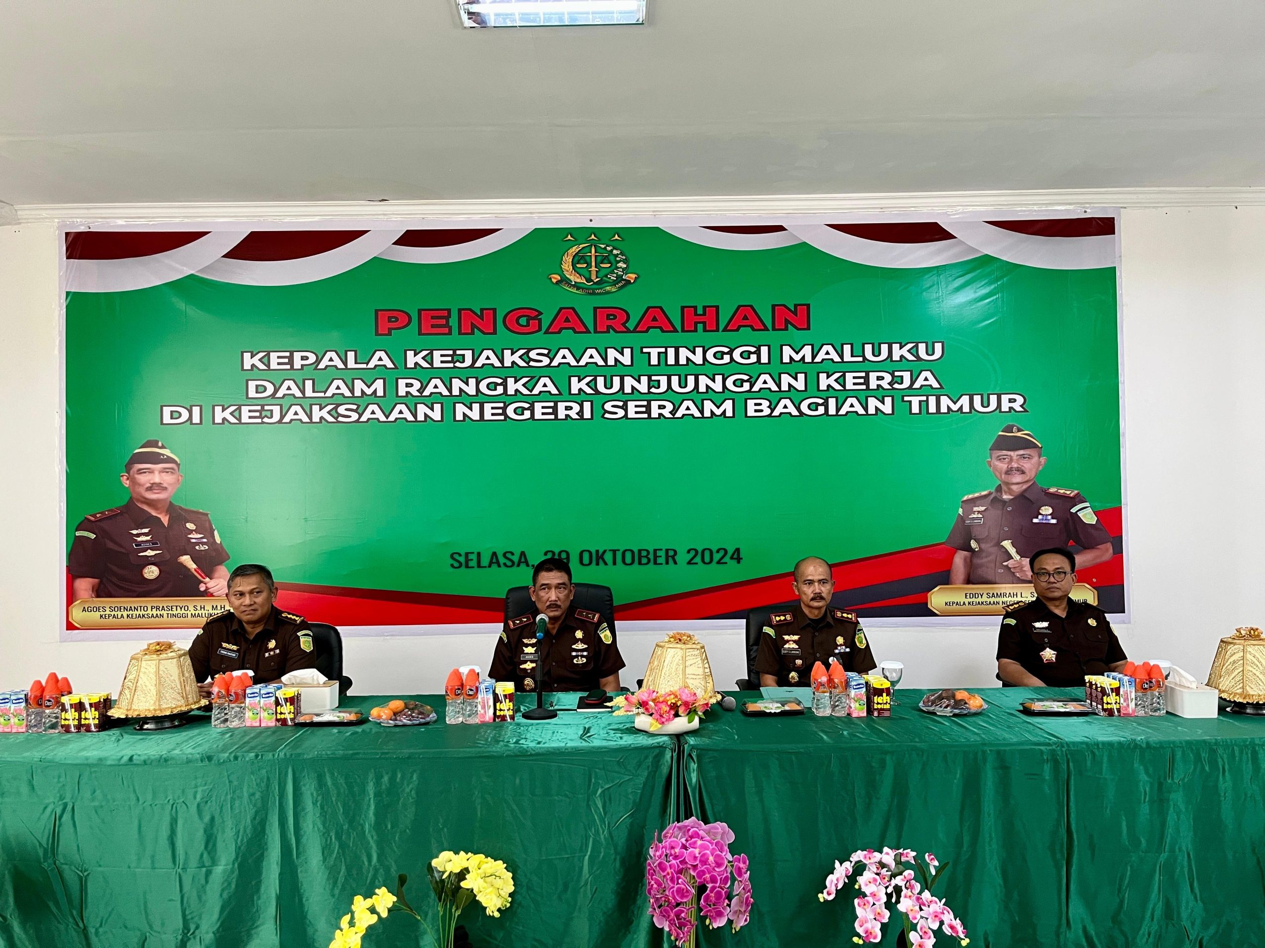 Kepala Kejaksaan Tinggi Maluku beserta rombongan kembali melanjutkan kegiatan berupa Supervisi Pimpinan di Kejaksaan Negeri Seram Bagian Timur yang dipusatkan di Aula Kantor Kejaksaan Negeri Seram Bagian Timur dengan dihadiri oleh para kepala seksi, Kasubagbin serta Para Pegawai Jaksa dan Tata Usaha pada Kejaksaan Negeri Seram Bagian Timur.