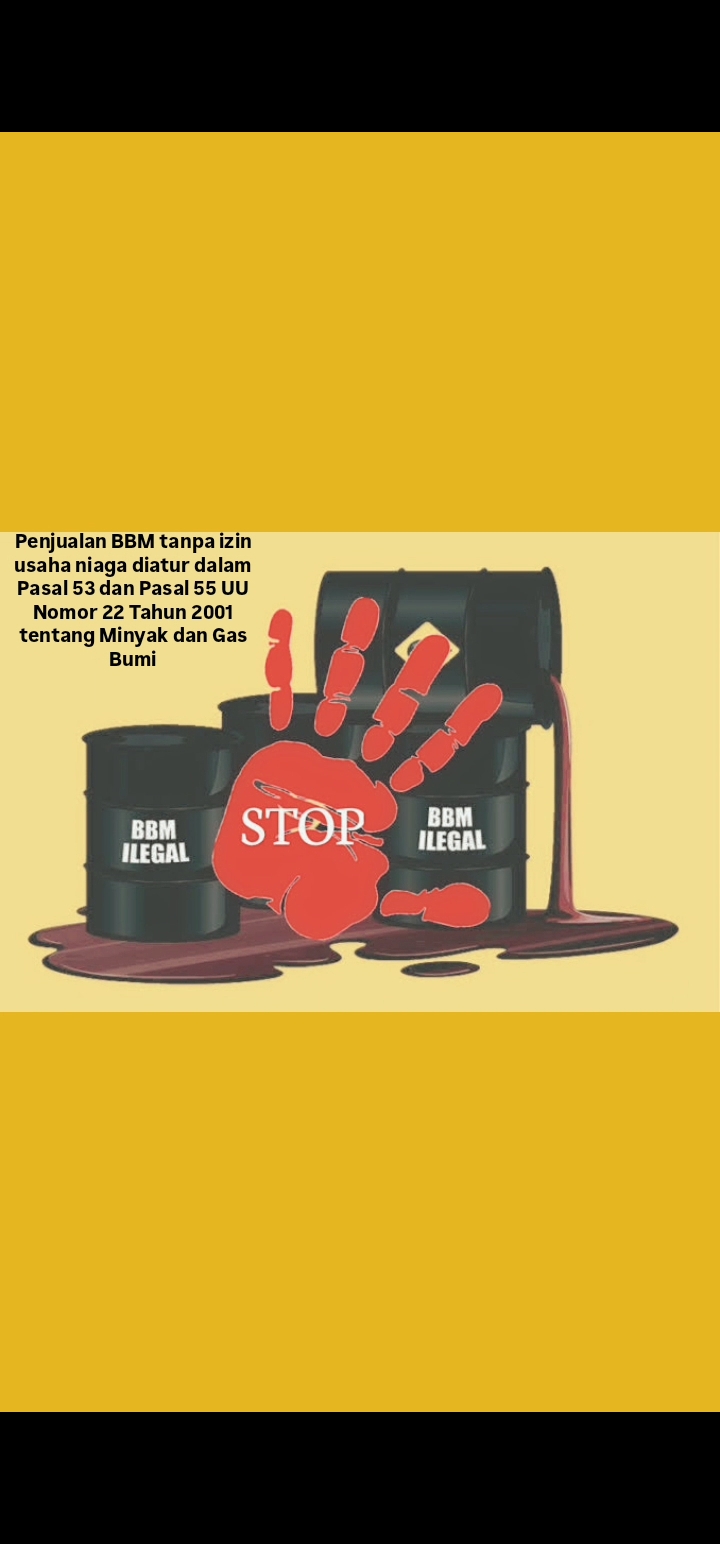 Penjualan BBM tanpa izin usaha niaga diatur dalam Pasal 53 dan Pasal 55 UU Nomor 22 Tahun 2001 tentang Minyak dan Gas Bumi.