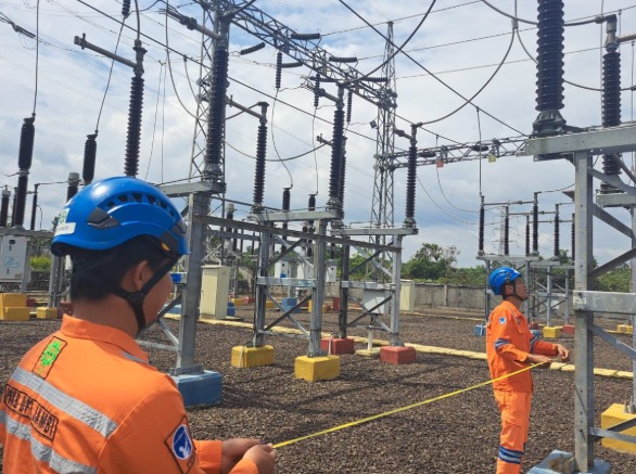 Jambi – Tim Pekerjaan Dalam Keadaan Bertegangan (PDKB) PLN UPT Jambi melaksanakan kegiatan Job Safety Analysis (JSA) perbaikan hotspot clamp PMS 6B4-3 bay penghantar Sumsel V 2 di Gardu Induk Tegangan Ekstra Tinggi (GITET) New Aurduri pada Kamis (5/12).
