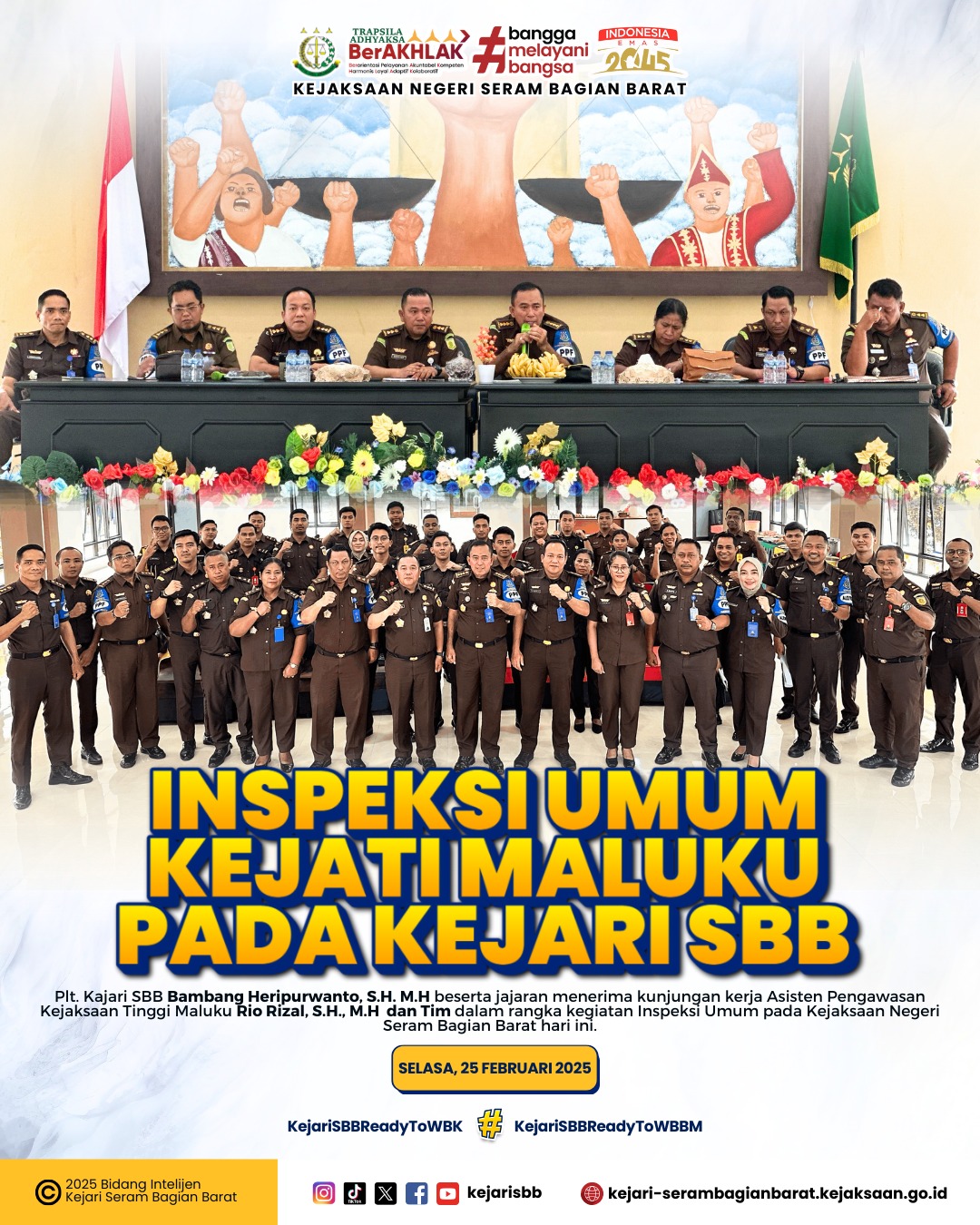 UtamaPos.com || Seram Bagian Barat- Selasa, 25 Februari 2025 Plt. Kajari SBB Bambang Heripurwanto, S.H., M.H beserta para Kasi dan seluruh jajaran menerima kunjungan kerja dari Asisten Pengawasan pada Kejaksaan Tinggi Maluku Rio Rizal S.H., M.H beserta rombongan dalam rangka kegiatan Inspeksi Umum pada Kejaksaan Negeri Seram Bagian Barat.