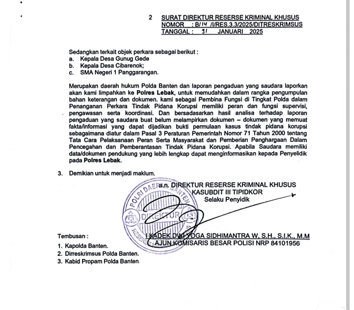 Awalnya Dani Sebagai Aktivis Banten Raya melaporkan, duggan tindak pidana korupsi Desa Cibarengkok dan Desa Gunung Gede ke tipidkor Polda Banten, menurut unit Tipidkor Polda Banten, ini bagian polres Lebak yang harus menanganinya, karena. ini TKP nya di Kabupaten Lebak, sehingga kami akan melimpahkan berkas ini ke polres dan akan kami kawal sampai tuntas, tegas wasidik Polda Banten dirilis pada 31 Januari 2025,