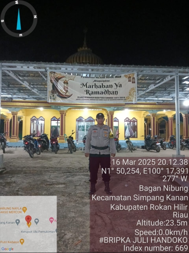 UtamaPos.com || Simpang Kanan- Minggu 16 Maret 2025 pukul 20.10 wib s/d selesai, Personil Polsek Simpang Kanan melaksanakan giat patroli saat masyarakat melaksanakan ibadah sholat tarawih di masjid / mushola di Wilayah Hukum Polsek Simpang Kanan.