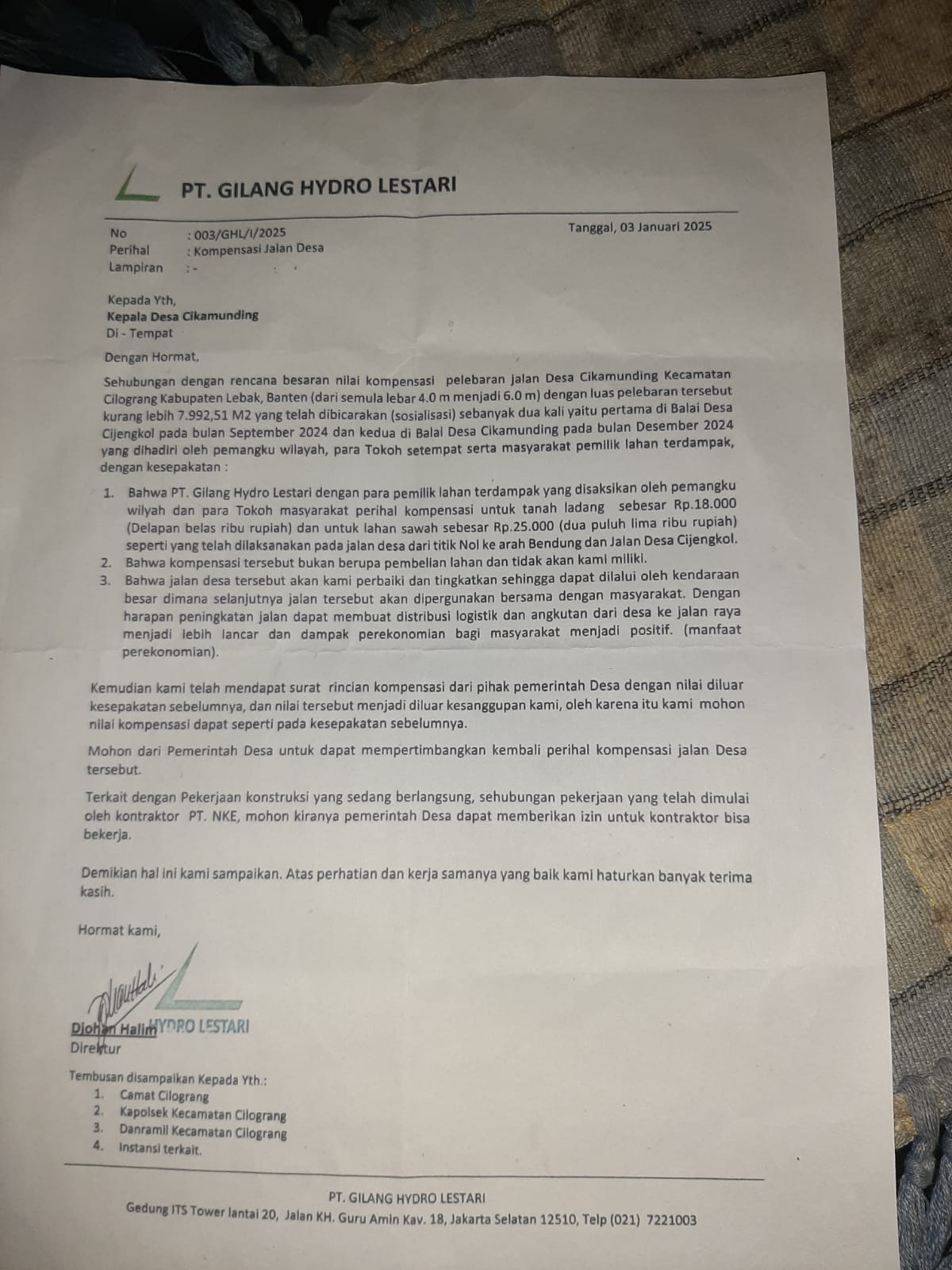 “Dalam pernyataannya tersebut Perusahaan selalu mengikuti Regulasi pemerintah dalam setiap langkahnya bahwa PT GILANG HYDRO LESTARI dengan para pemilik lahan yang terdampak disaksikan para pemangku wilayah dan tokoh masyarakat, konpensasi untuk tanah ladang,sebesar Rp 180.000.(delapan belas ribu rupiah)dan untuk lahan sawah sebesar Rp 25.000.(dua puluh lima ribu rupiah) konpensasi tersebut bukan berupa pembelian lahan dan pihak perusahaan tidak akan memiliki lahan tersebut.