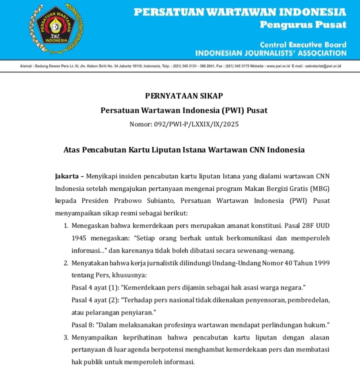 Jakarta – Persatuan Wartawan Indonesia (PWI) Pusat menyampaikan keprihatinan atas pencabutan kartu liputan Istana yang dialami wartawan CNN Indonesia usai melontarkan pertanyaan mengenai program Makan Bergizi Gratis (MBG) kepada Presiden Prabowo Subianto, Sabtu (27/9).