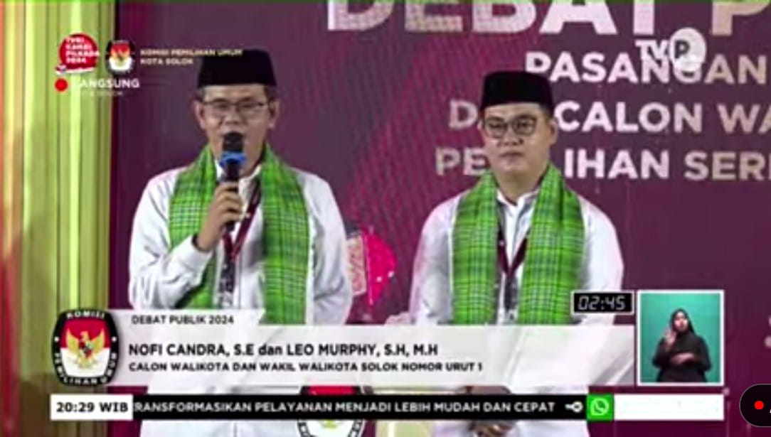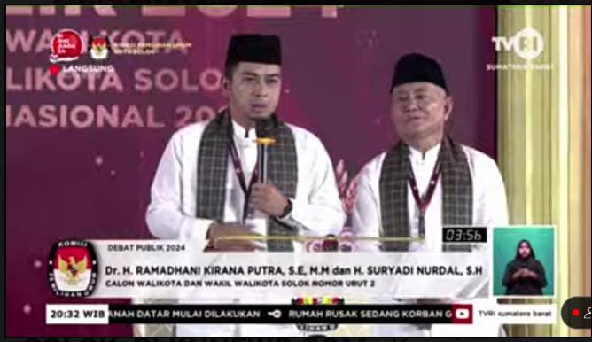 SOLOK – Komisi Pemilihan Umum (KPU) Kota Solok bersama TVRI Sumbar menggelar Debat Perdana Pasangan Calon (Paslon) Walikota-Wakil Walikota Solok 2024 di Premier Hotel Syariah Kota Solok, Jumat malam (8/11/2024). Kedua Paslon yakni Paslon nomor urut 1, H. Nofi Candra, SE – Leo Murphy, SH, MH dan Paslon nomor urut 2, Dr. H. Ramadhani Kirana Putra, SE, MM – Suryadi Nurdal, SH, tampil “sempurna” dengan menampilkan “kepiawaian” masing-masing. Secara umum, berbagai pihak menilai Paslon Ramadhani-Suryadi unggul dalam debat tersebut, karena memiliki kemampuan retorika. Namun, Paslon Nofi Candra-Leo Murphy lebih unggul dalam logika, karena program dan Visi Misi yang dikedepankan sangat masuk akal, alias logis.